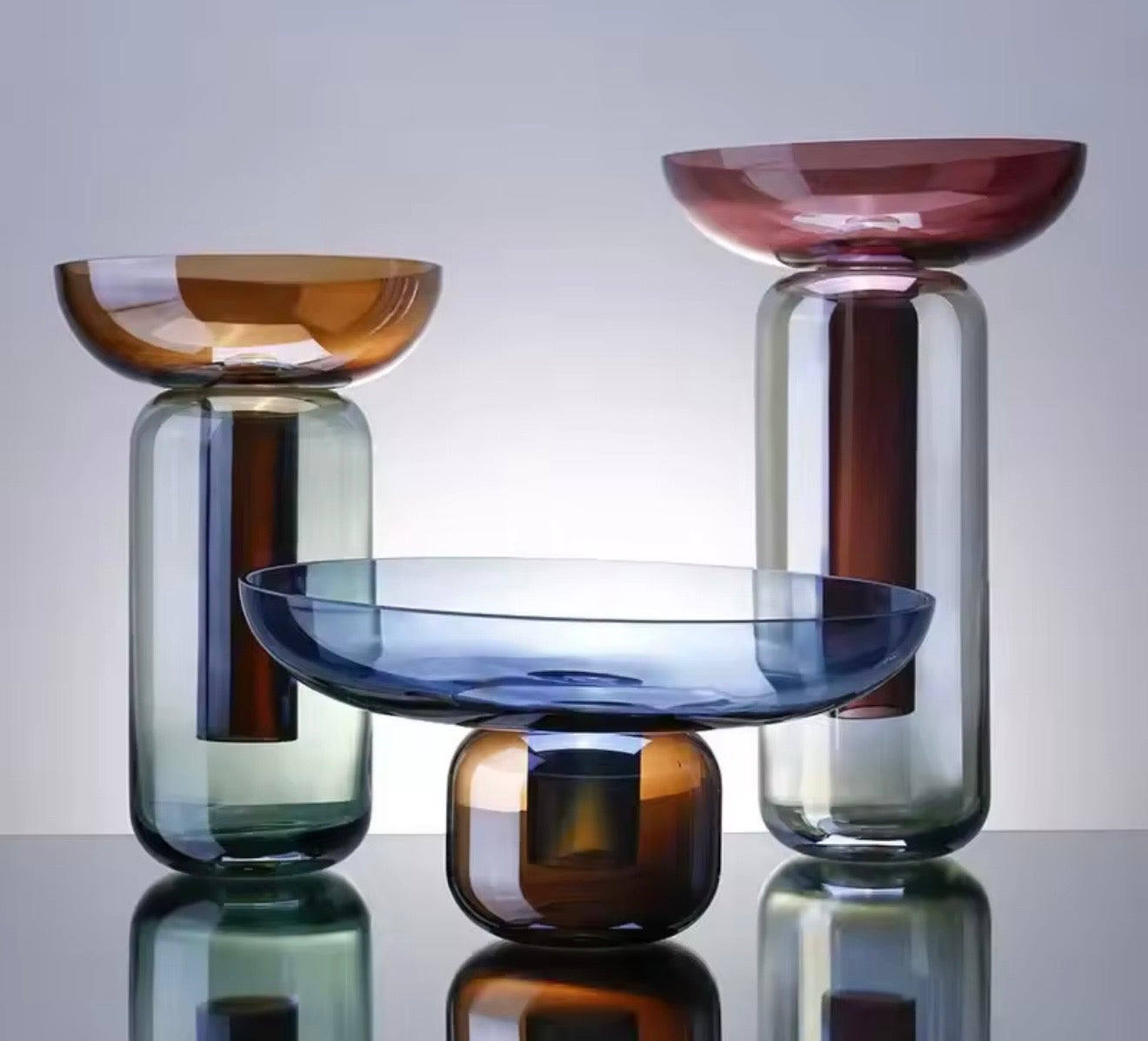 Jarrones de vidrio en distintas tonalidades y formas